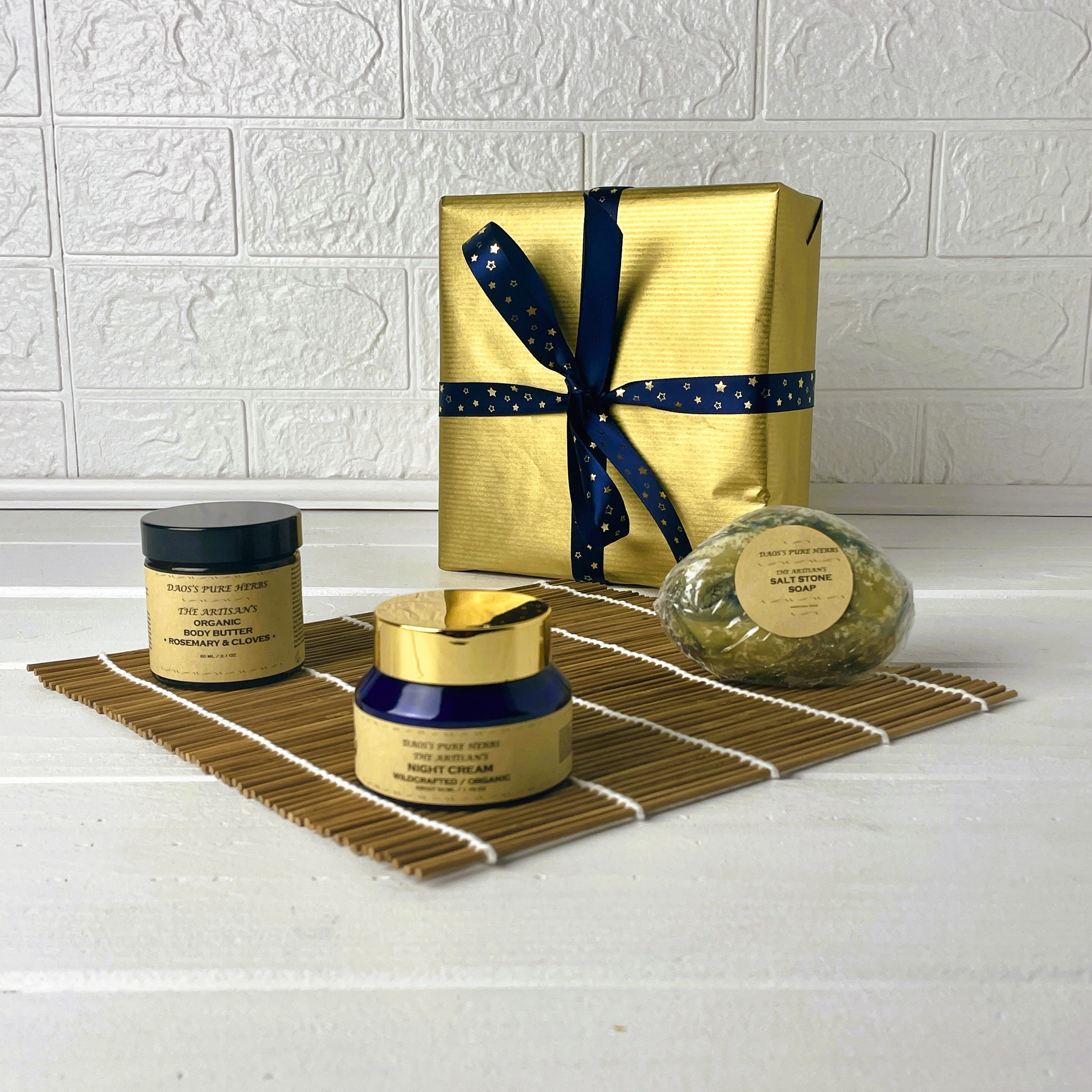 The set includes one exfoliating handmade soap, a silky night face cream, and a nourishing body butter in a glass jar. Together, they create a complete routine of cleansing, hydration, and nourishment — perfect for quiet moments of self‑care.