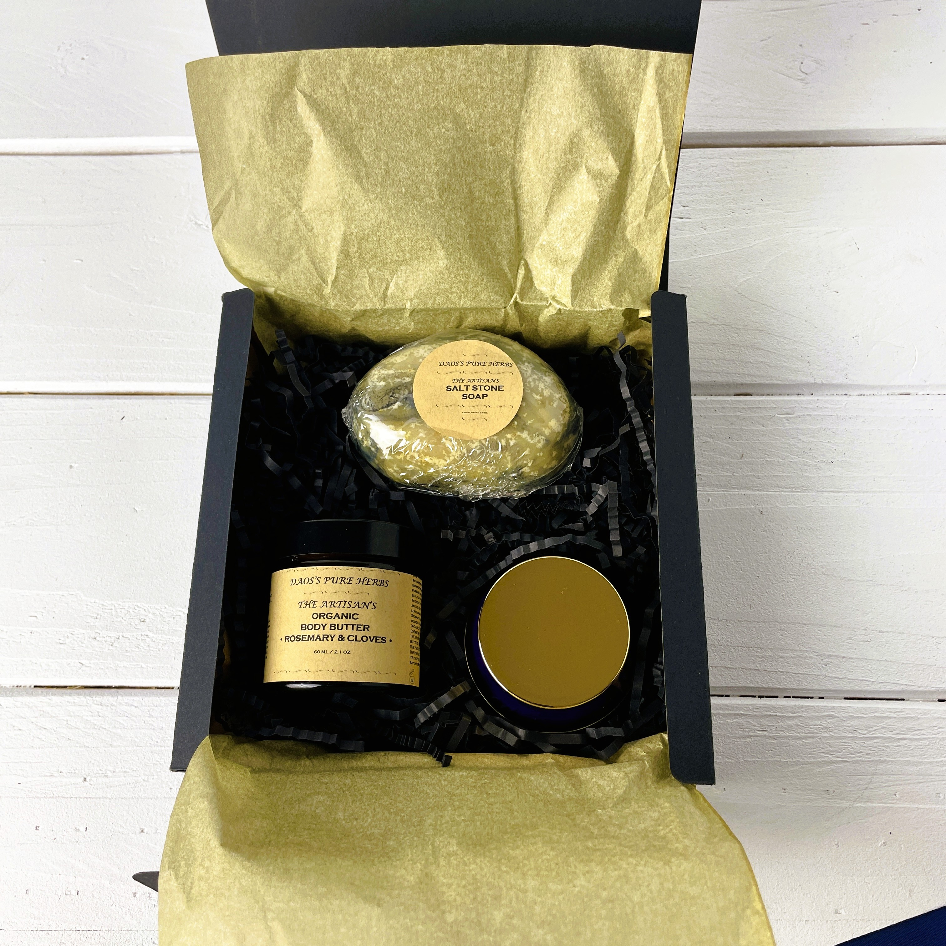 The set includes one exfoliating handmade soap, a silky night face cream, and a nourishing body butter in a glass jar. Together, they create a complete routine of cleansing, hydration, and nourishment — perfect for quiet moments of self‑care.
